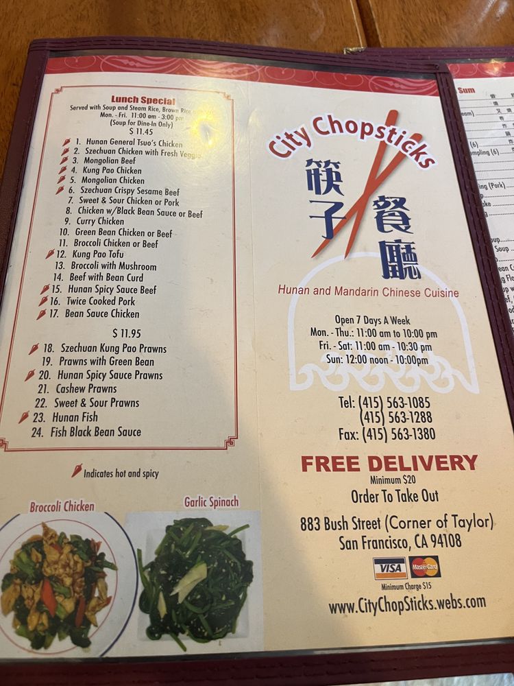 City Chopsticks is a casual Chinese restaurant located in San Francisco, offering a variety of appetizers, dim sum, soups, beef, and lamb dishes. The menu features favorites like Shrimp Dumplings, Hot and Sour Soup, and Beef with Black Bean Sauce. Customers praise the generous portions and delicious flavors, with dishes like Salt and Pepper Pork Ribs and Eggplant with Garlic standing out. The restaurant offers delivery, takeout, reservations, and catering services, making it convenient for a quick meal or a group gathering. The atmosphere is described as casual with moderate noise levels, perfect for lunch or dinner. Overall, City Chopsticks is a hidden gem on Bush Street, offering authentic Chinese cuisine and friendly service.